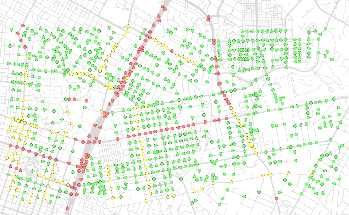Then, after running the model and generating a csv of perceived cycling safety index, I appended this csv to correspond to the coordinates of their corresponding GSV photos in ArcGIS Pro, and visualized the scores only at road intersections.