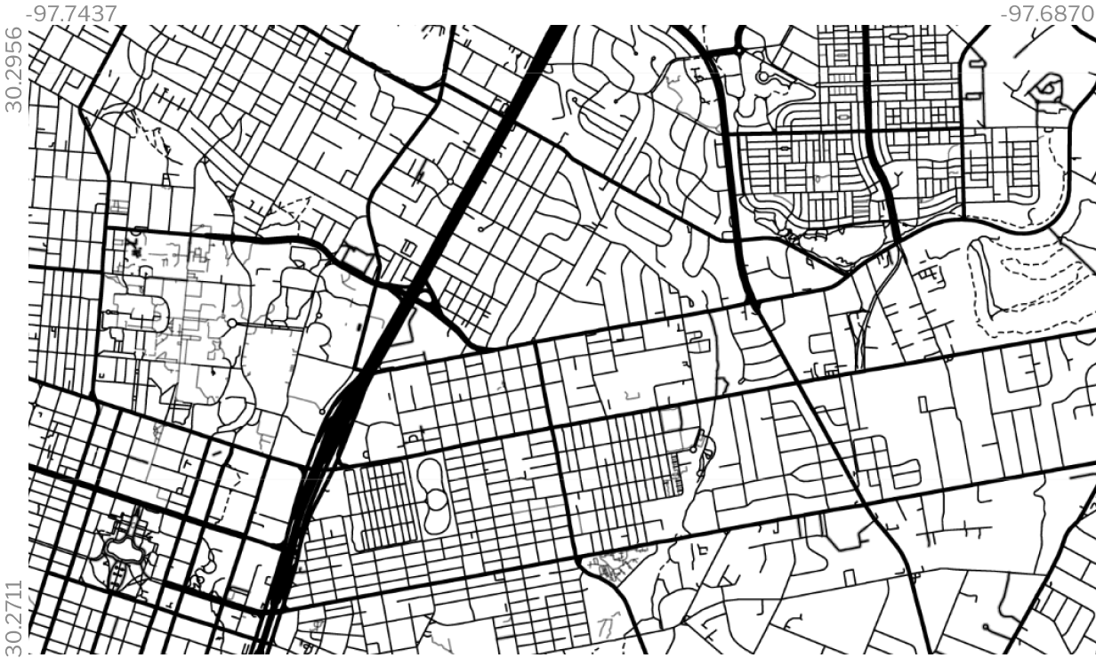 After confirming the topic, I selected the area bounded by coordinates (30.2711(S), 30.2956(N), -97.7437(W), -97.6870(E)) as the area for data mining.