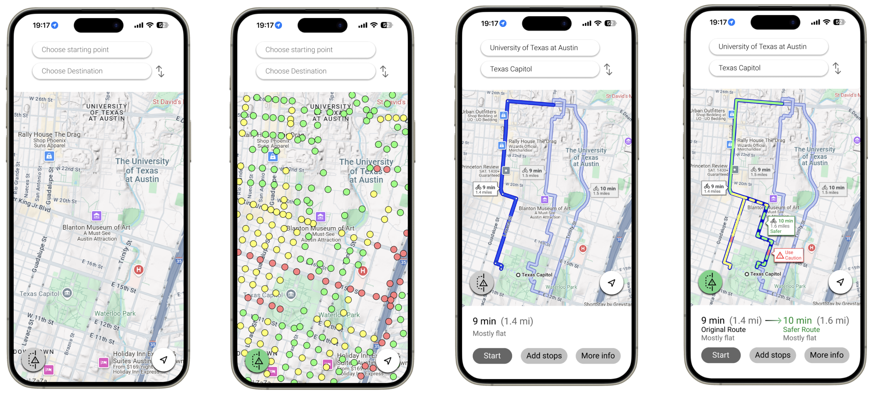 This project leverages machine learning techniques to predict perceived cycling safety in Austin, Texas with visual and ethnographical data. The data inform a mobile application that assists cyclists to identify potential accident risks on their routes and suggests safer detours.