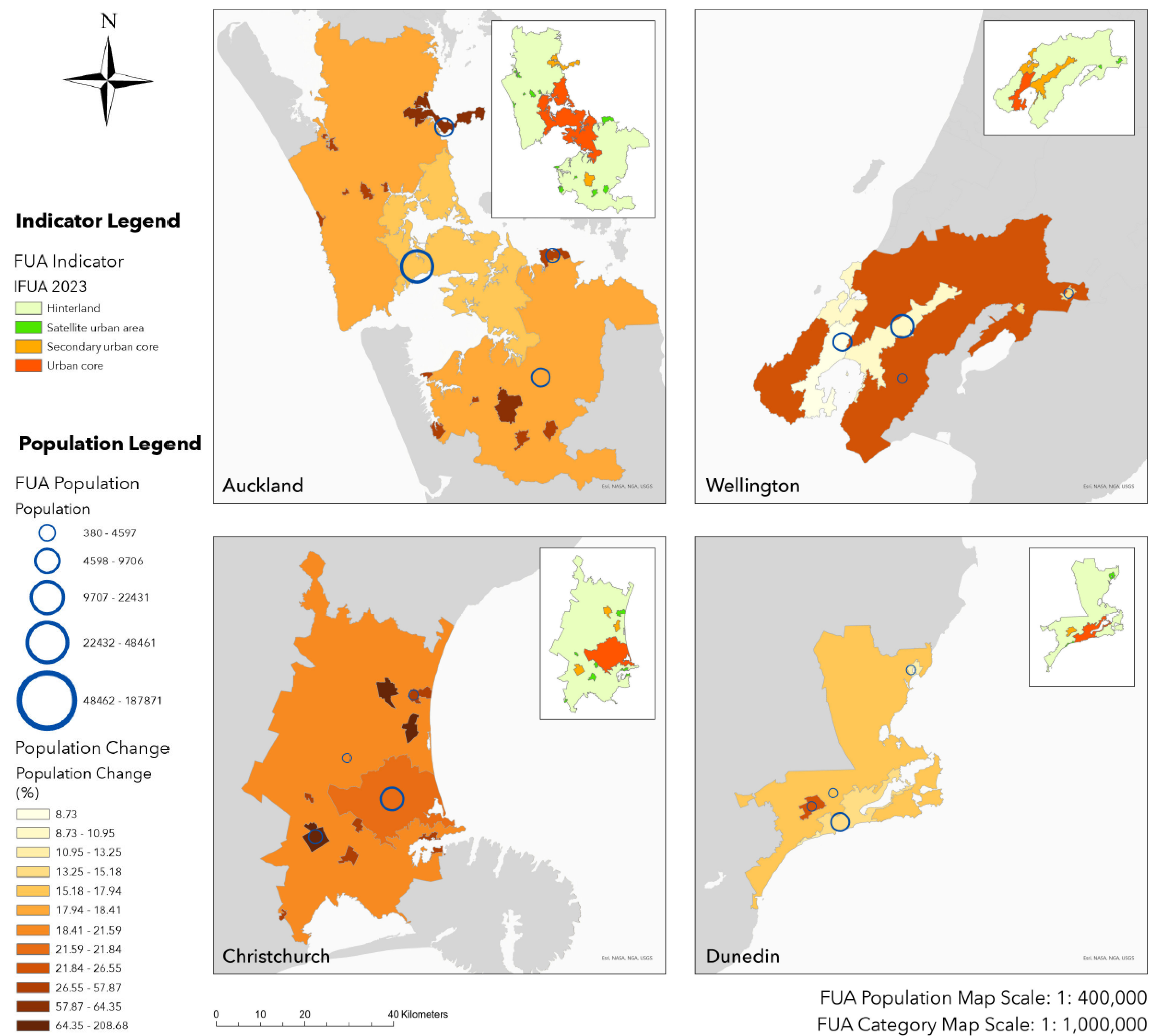 After the data integration and visualization process, we observed variations in Maori population change rates across different FUA indicators. While the total Maori population remains highest in urban cores, a notable trend is that the population growth rates are higher in peripheral areas, such as secondary urban cores, satellite urban areas, and hinterlands. While there is an increase in Maori population in hinterland areas, the population count is relatively lower than urban cores, secondary urban cores, and satellite urban areas. We could draw the conclusions that urbanization and sprawl in New Zealand metropolitan areas have influenced the lifestyles of Maori residents, with many of the population choosing to commute to urban cores while living in secondary and satellite urban areas.